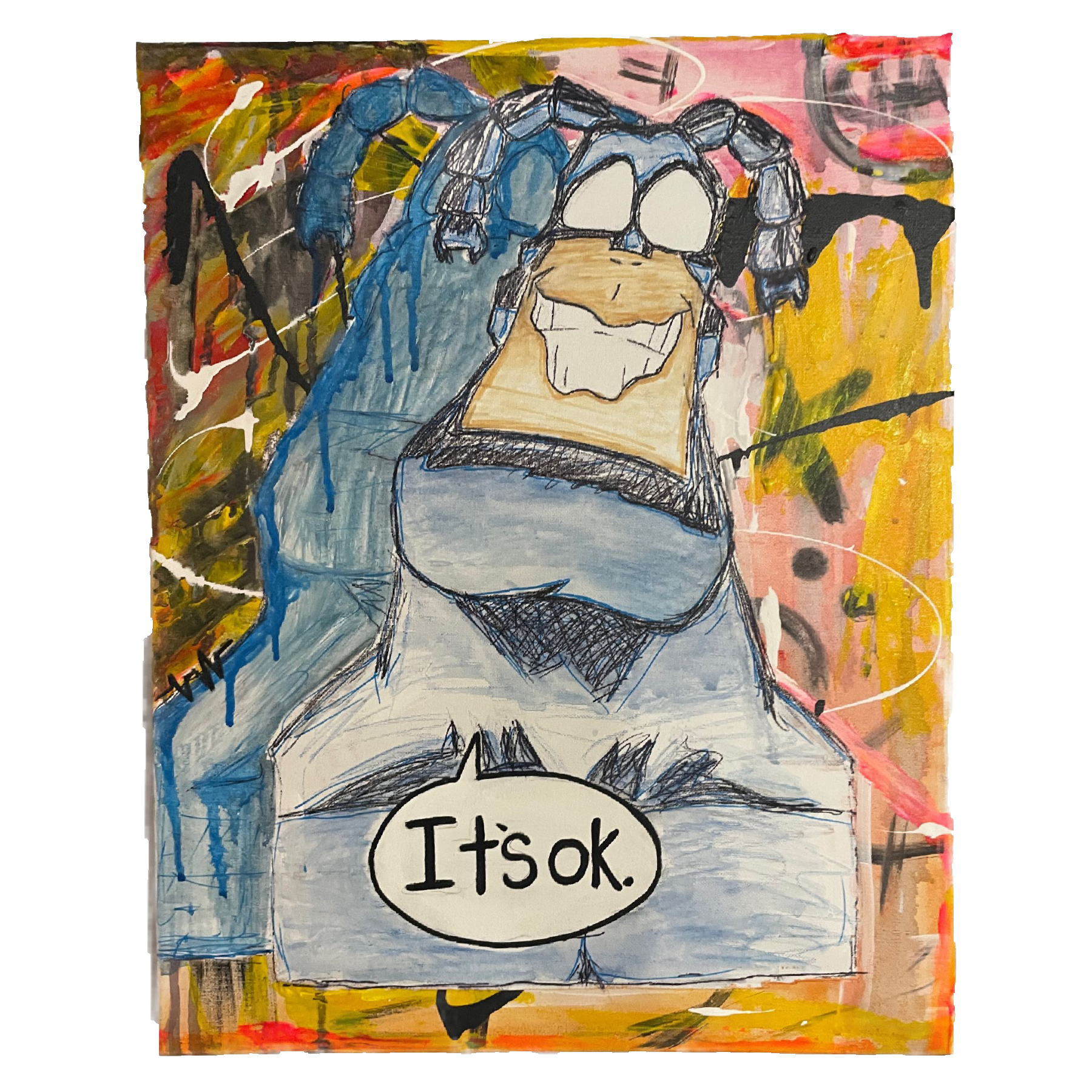 Created on a 20 x 16 inch canvas, the piece layers acrylic, ink, and expressive mark-making over an energetic abstract background. Drips, scratches, and raw lines collide with bold color fields, capturing the exaggerated optimism and ridiculous confidence that made The Tick unforgettable. The speech bubble — “It’s ok.” — transforms the character’s comic bravado into something softer: reassurance, resilience, and survival.